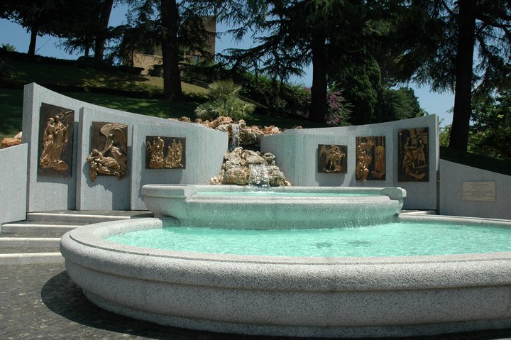 La fontana é formata da due grandi vasche ellittiche in granito e porfido della val di Genova e di Cembra, di sei e otto metri, digradanti e comunicanti ed è arricchita da sei formelle bronzee dellartista bellunese Franco Murer,